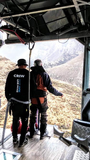 The Nevis Bungy Jump main building is located at the top of a deep canyon. There are large wire rope cables strung between the peaks. On these is a hi-tech motorized platform which drives the car out to the center of the canyon. The Platform is a maybe 10×10 foot square room suspended below the cables. It remains stationary in it’s location. To Access it you must first don a harness then get clipped into a safety wire attached to the top of a small aluminum trolley car designed to carry several people at a time to an from the suspended platform. The crossing itself just getting to the airborne platform in the center of the canyon started to give one a feeling of unease as it gained height as it neared the main jumping station which was 134 meters above the canyon floor. (That’s almost 400 feet for those from the old system.)